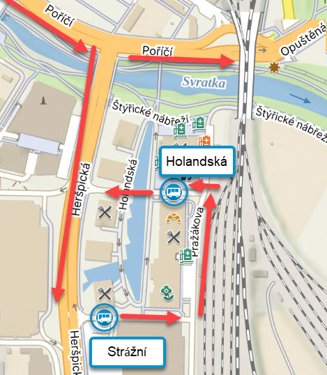 Okružní linky 44 a 84 nově obsluhují zastávku Strážní a Holandská zastavující u Spielberk Office Center (Hornbach Vídeňská)